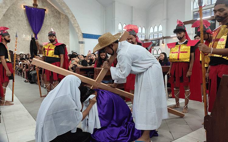 PALANGKA RAYA — Suasana hening mendadak berubah menjadi dramatis di Katedral Santa Maria Palangka Raya saat prosesi Jalan Salib divisualisasikan dalam bentuk tablo pada peringatan Jumat Agung, Jumat (3/4/2026).