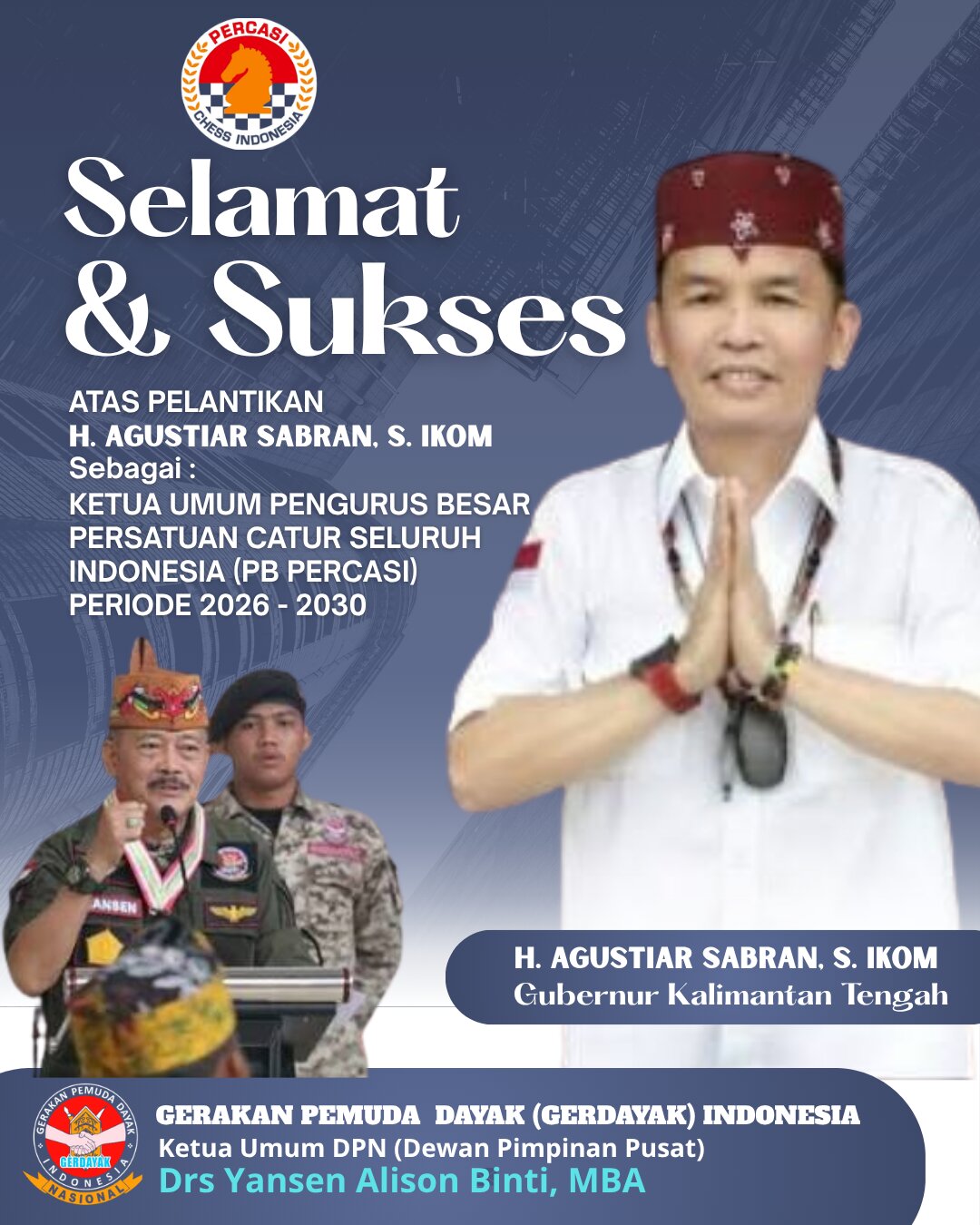 “Atas nama pribadi dan seluruh keluarga besar Gerakan Pemuda Dayak (Gerdayak) Indonesia, kami mengucapkan selamat dan sukses kepada Bapak Agustiar Sabran atas terpilihnya sebagai Ketua Umum PB Percasi periode 2026-2030,” ujar Yansen dalam keterangannya, Minggu (12/04/2026).