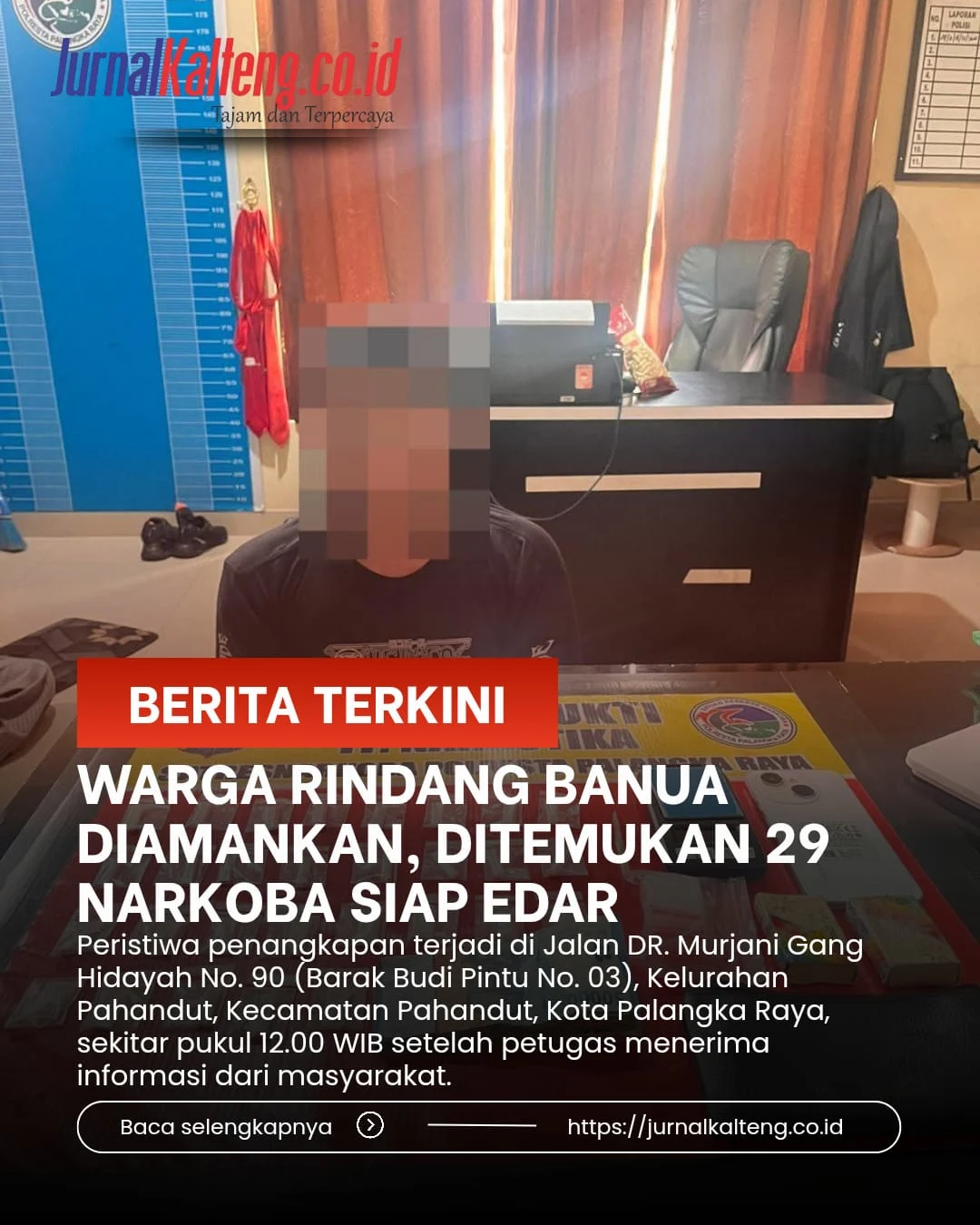 Peristiwa penangkapan terjadi di Jalan DR. Murjani Gang Hidayah No. 90 (Barak Budi Pintu No. 03), Kelurahan Pahandut, Kecamatan Pahandut, Kota Palangka Raya, sekitar pukul 12.00 WIB setelah petugas menerima informasi dari masyarakat.