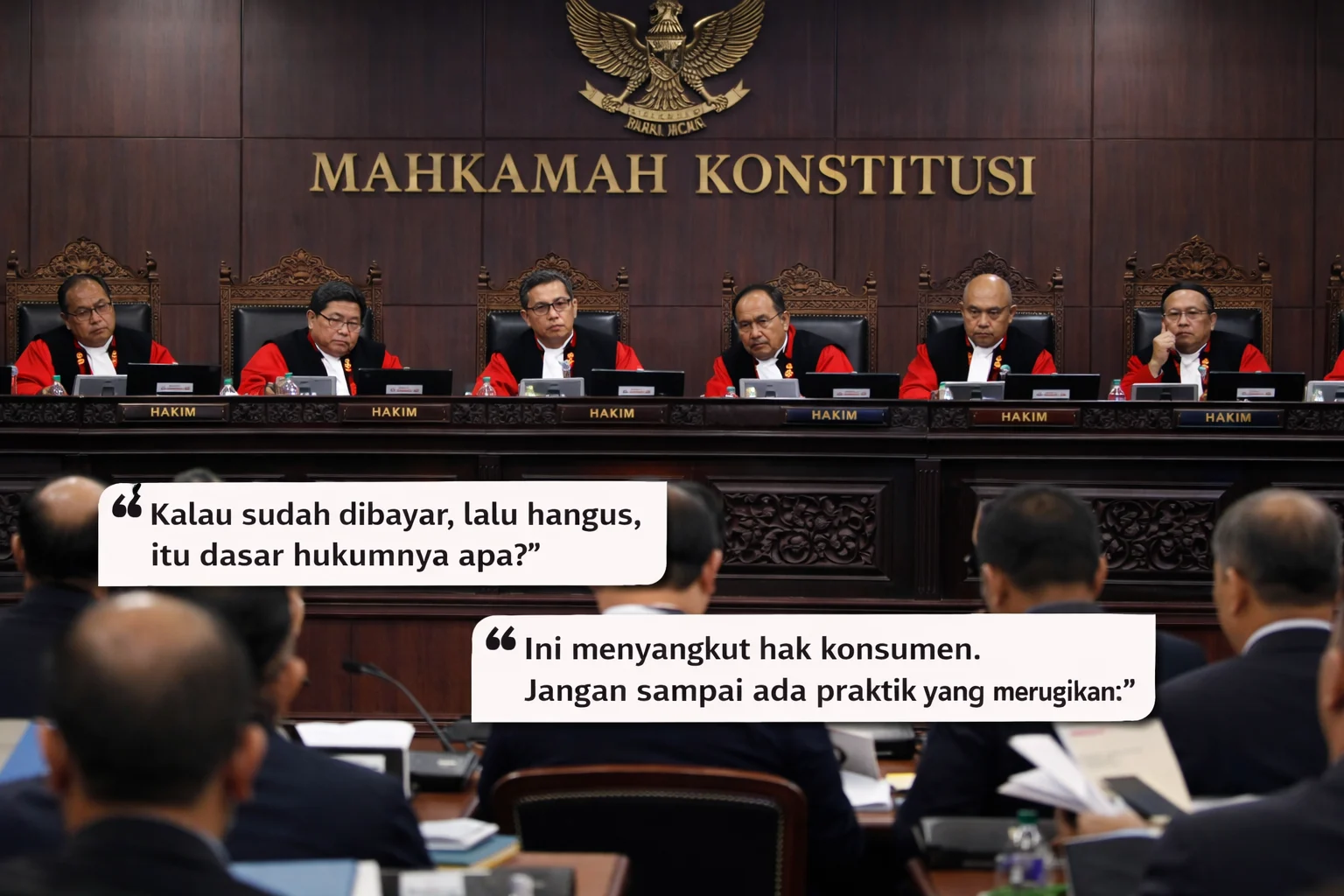 “Kalau sudah dibayar, lalu hangus, itu dasar hukumnya apa?” ujar salah satu hakim dalam persidangan.