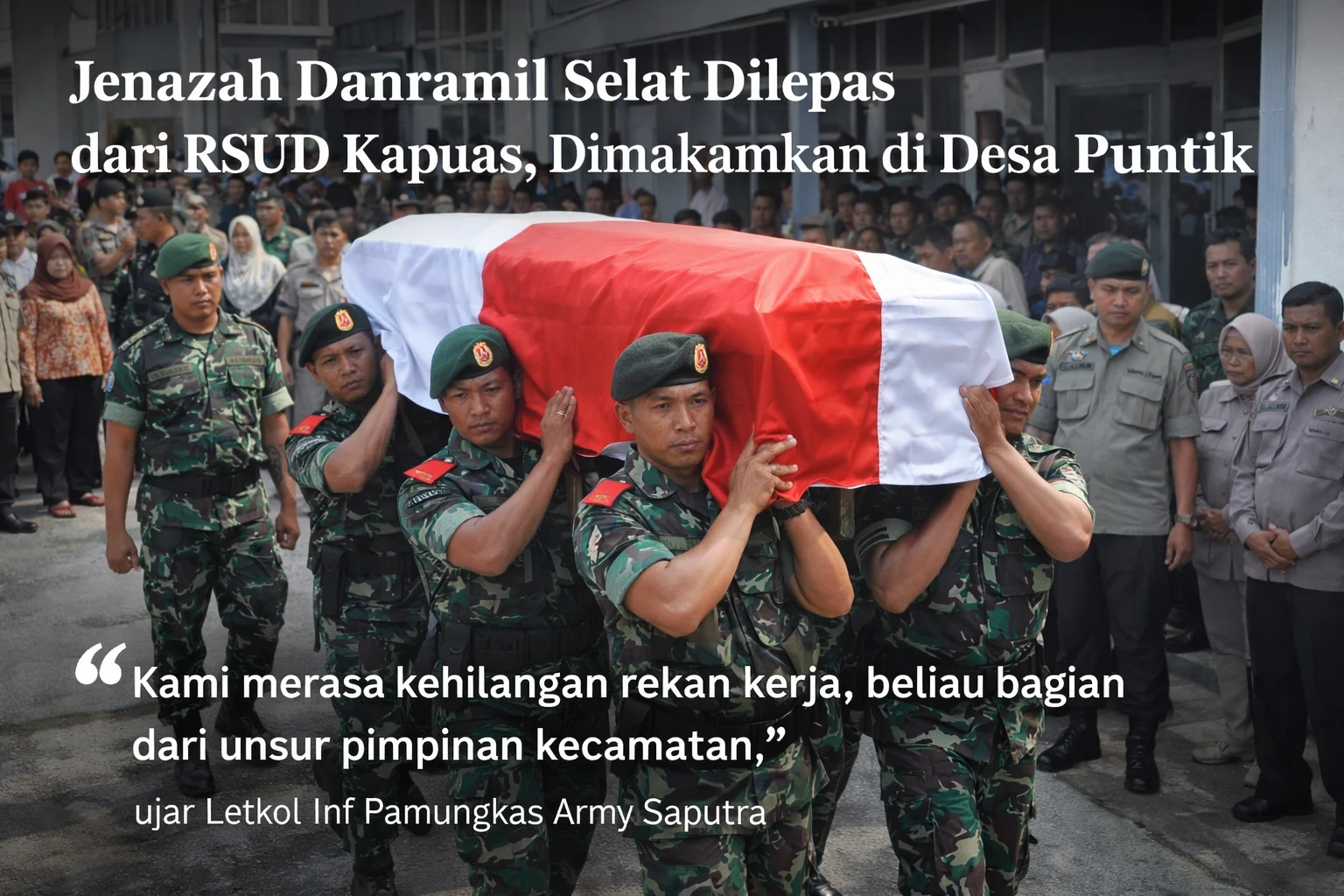 Prosesi pelepasan jenazah berlangsung dengan dihadiri jajaran TNI dari Kodim 1011/Kuala Kapuas, termasuk Dandim Letkol Inf Pamungkas Army Saputra, serta sejumlah perwira dan kerabat almarhum.