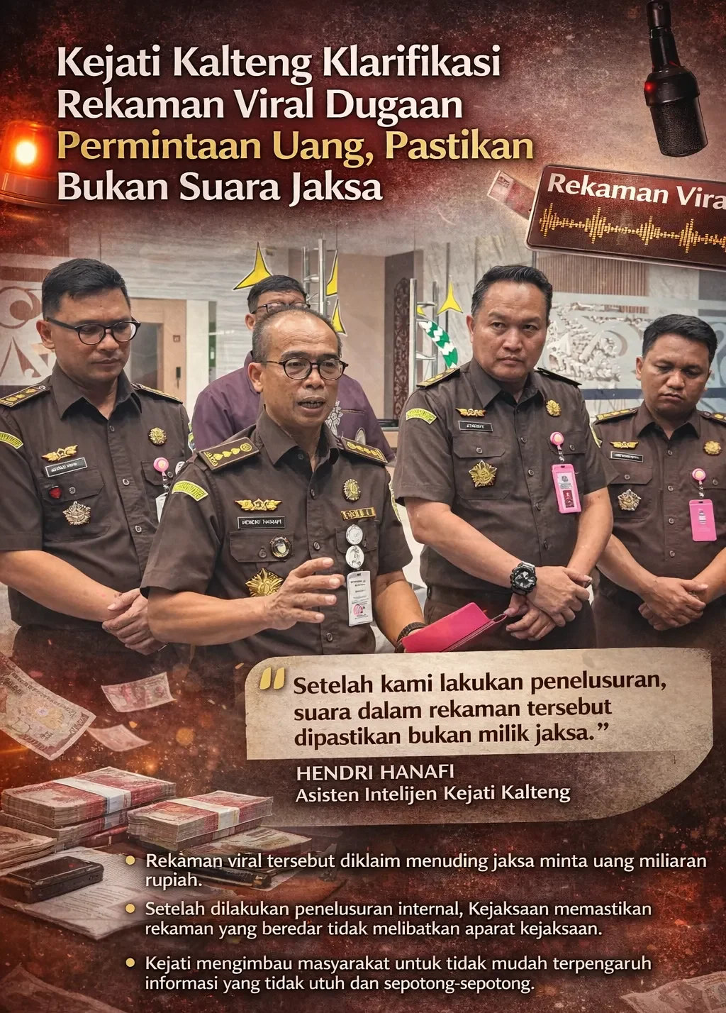 Asisten Intelijen Kejati Kalteng, Hendri Hanafi, menegaskan pihaknya telah melakukan verifikasi terhadap isi rekaman yang beredar di media sosial.