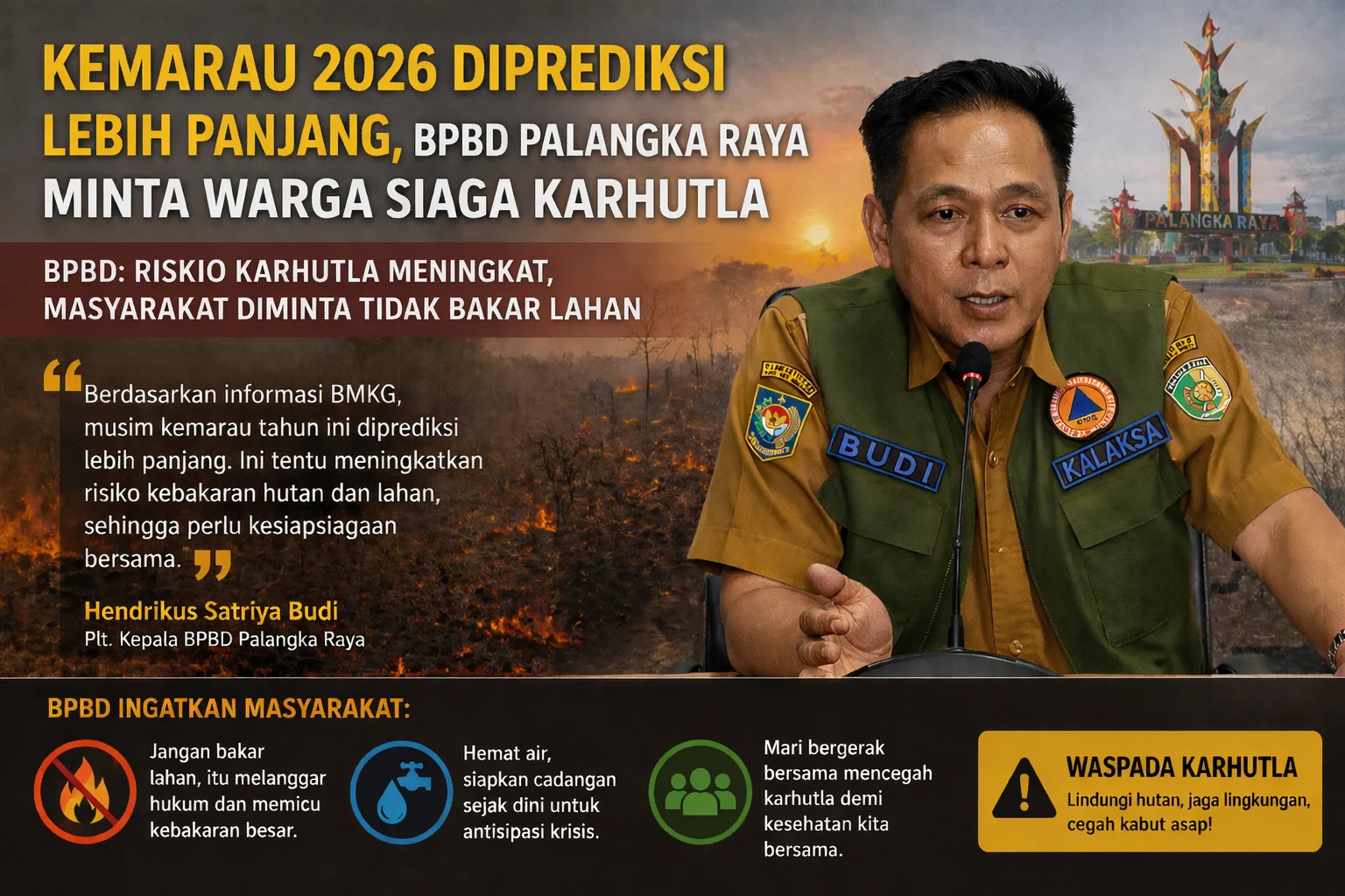 Pelaksana Tugas Kepala BPBD Palangka Raya, Hendrikus Satriya Budi, menegaskan bahwa risiko karhutla tahun ini diperkirakan meningkat dibandingkan periode sebelumnya. Faktor utama berasal dari proyeksi Badan Meteorologi, Klimatologi, dan Geofisika (BMKG) terkait durasi kemarau yang lebih panjang.