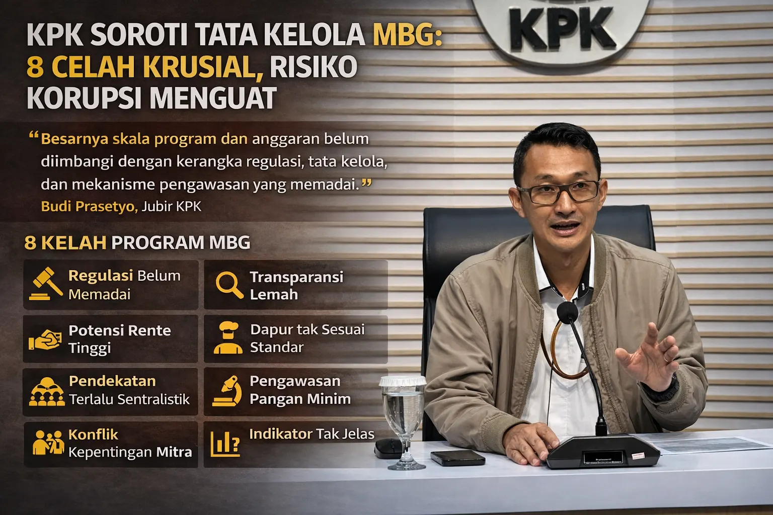 JAKARTA — Komisi Pemberantasan Korupsi (KPK) mengungkap delapan persoalan mendasar dalam tata kelola program Makan Bergizi Gratis (MBG). Temuan ini menyoroti lemahnya fondasi kebijakan pada program berskala besar tersebut, yang dinilai membuka ruang risiko penyimpangan.