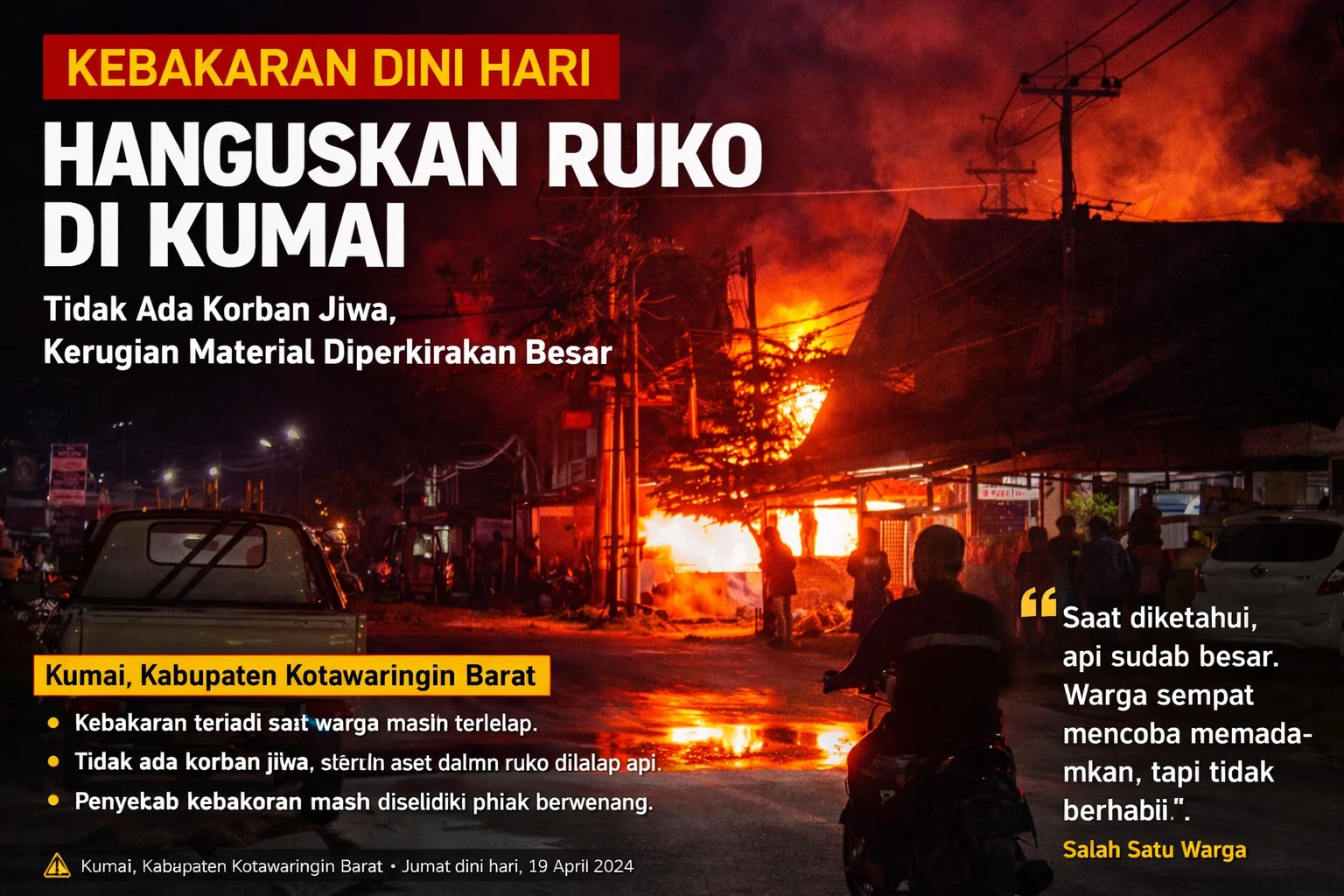 Kotawaringin Barat — Kebakaran yang terjadi pada dini hari di Kecamatan Kumai, Kabupaten Kotawaringin Barat, Kalimantan Tengah, menghanguskan satu unit rumah toko (ruko) beserta seluruh isinya. Peristiwa ini terjadi saat sebagian besar warga masih beristirahat, sehingga api cepat membesar tanpa penanganan awal yang optimal.
