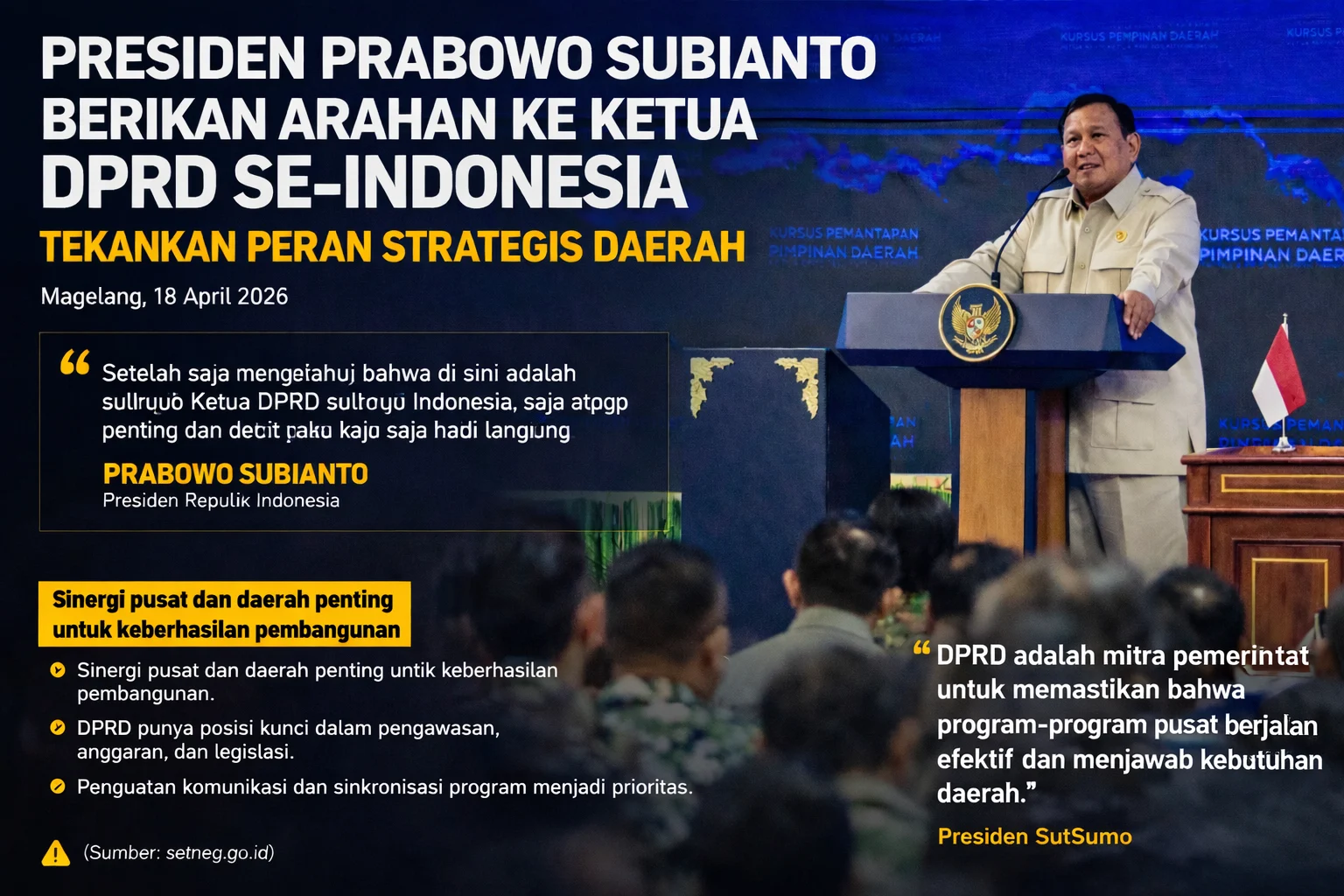 Magelang — Presiden Prabowo Subianto memberikan pengarahan langsung kepada para Ketua DPRD seluruh Indonesia dalam forum Kursus Pemantapan Pimpinan Daerah (KPPD), Sabtu (18/4/2026). Kehadiran kepala negara dalam forum tersebut menegaskan pentingnya peran legislatif daerah dalam mendukung agenda pembangunan nasional.