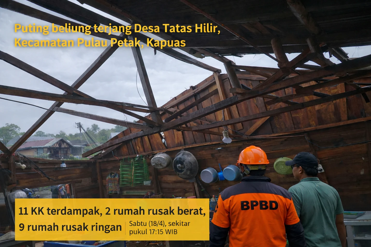 Kapuas — Angin puting beliung menerjang Desa Tatas Hilir, Kecamatan Pulau Petak, Kabupaten Kapuas, Kalimantan Tengah, Sabtu (18/4/2026) sore. Peristiwa yang terjadi sekitar pukul 17.15 WIB itu menyebabkan kerusakan rumah warga serta fasilitas umum.