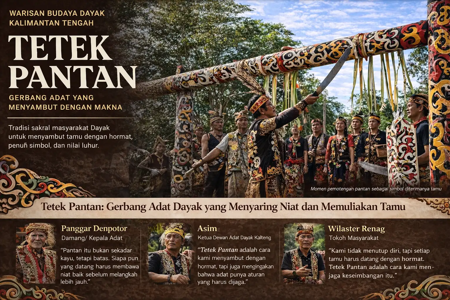 PALANGKA RAYA – Di Kalimantan Tengah, tamu tidak sekadar datang dan disambut. Ia harus melewati sebuah gerbang simbolik yang sarat makna: Tetek Pantan, tradisi adat masyarakat Dayak yang menandai penghormatan sekaligus penyaringan niat sebelum seseorang memasuki wilayah adat.
