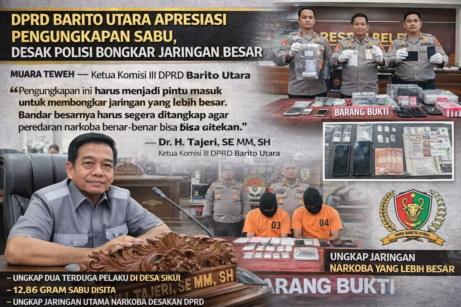 Ia menegaskan dukungan legislatif terhadap upaya kepolisian akan terus diberikan, sepanjang penanganan dilakukan secara komprehensif dan berkelanjutan untuk memutus mata rantai peredaran narkotika di Barito Utara.