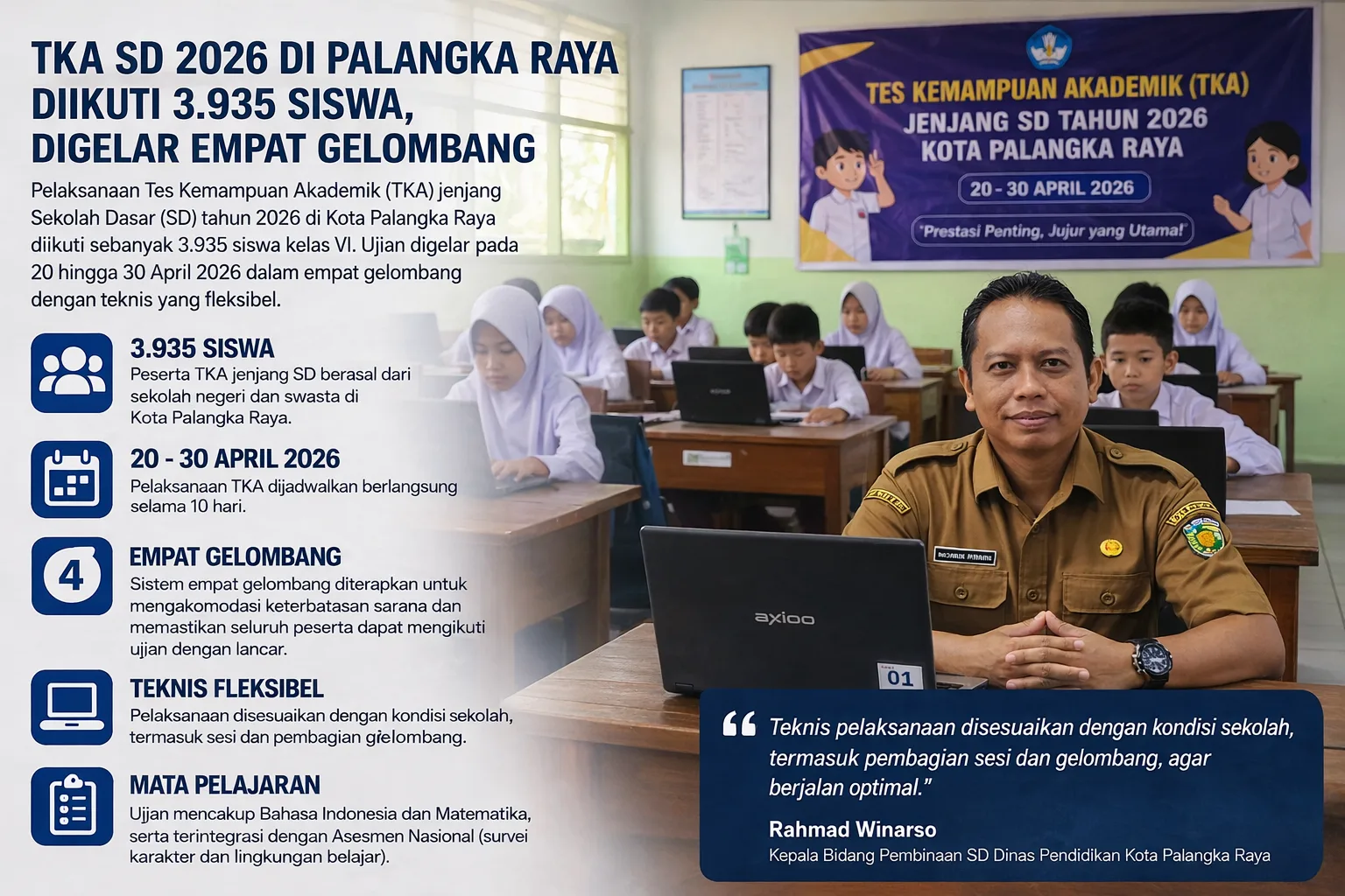 PALANGKA RAYA — Pelaksanaan Tes Kemampuan Akademik (TKA) jenjang Sekolah Dasar (SD) tahun 2026 di Kota Palangka Raya diikuti sebanyak 3.935 siswa kelas VI. Ujian tersebut dijadwalkan berlangsung pada 20 hingga 30 April 2026 dengan sistem pelaksanaan yang dibagi dalam empat gelombang.