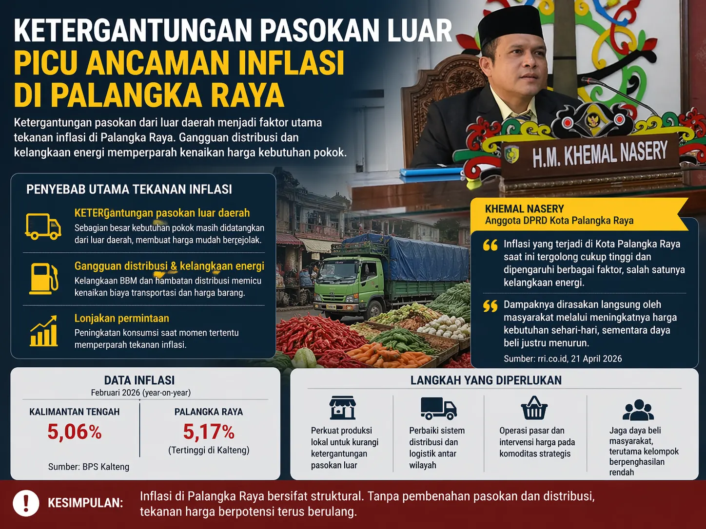 Anggota DPRD Kota Palangka Raya, Khemal Nasery, menegaskan tekanan inflasi tidak berdiri sendiri, melainkan dipengaruhi banyak faktor, termasuk distribusi dan ketersediaan energi.