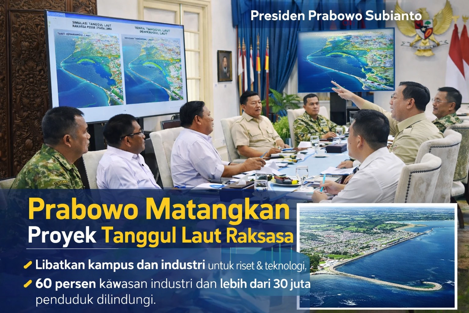 Jakarta – Presiden Prabowo Subianto memimpin rapat terbatas (ratas) untuk mematangkan pembangunan tanggul laut raksasa (giant sea wall) di pesisir utara Jawa. Proyek strategis nasional ini ditargetkan melindungi kawasan industri dan puluhan juta penduduk dari ancaman abrasi dan kenaikan muka air laut.