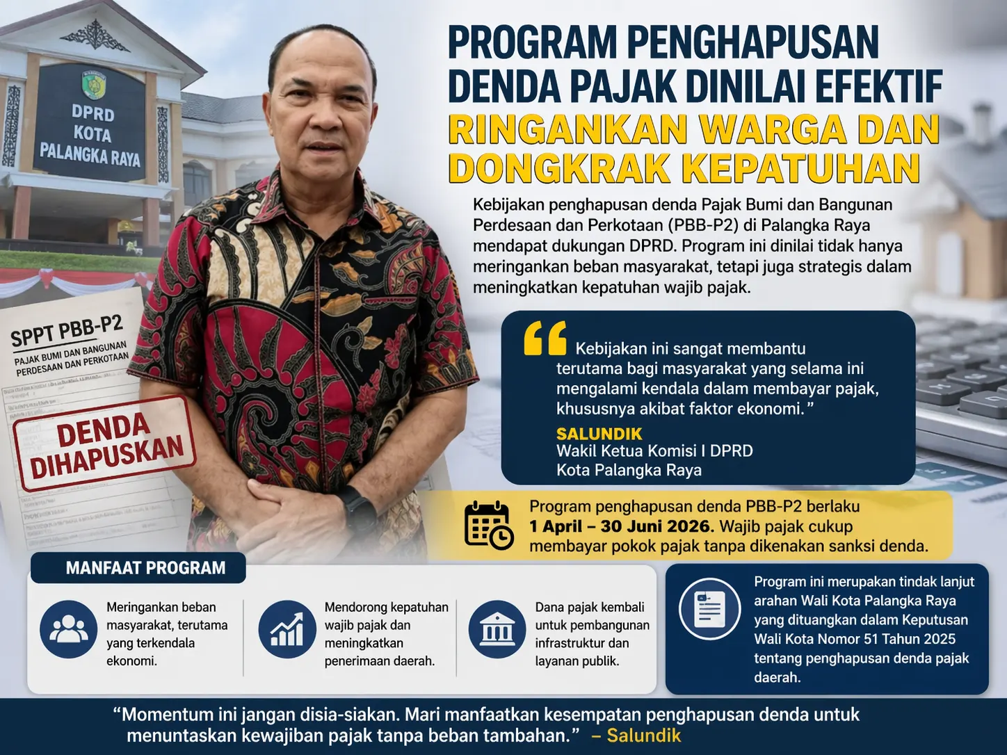 Wakil Ketua Komisi I DPRD Kota Palangka Raya, Salundik, menegaskan kebijakan tersebut menjadi momentum penting bagi masyarakat untuk menyelesaikan kewajiban pajak tanpa tekanan biaya tambahan.