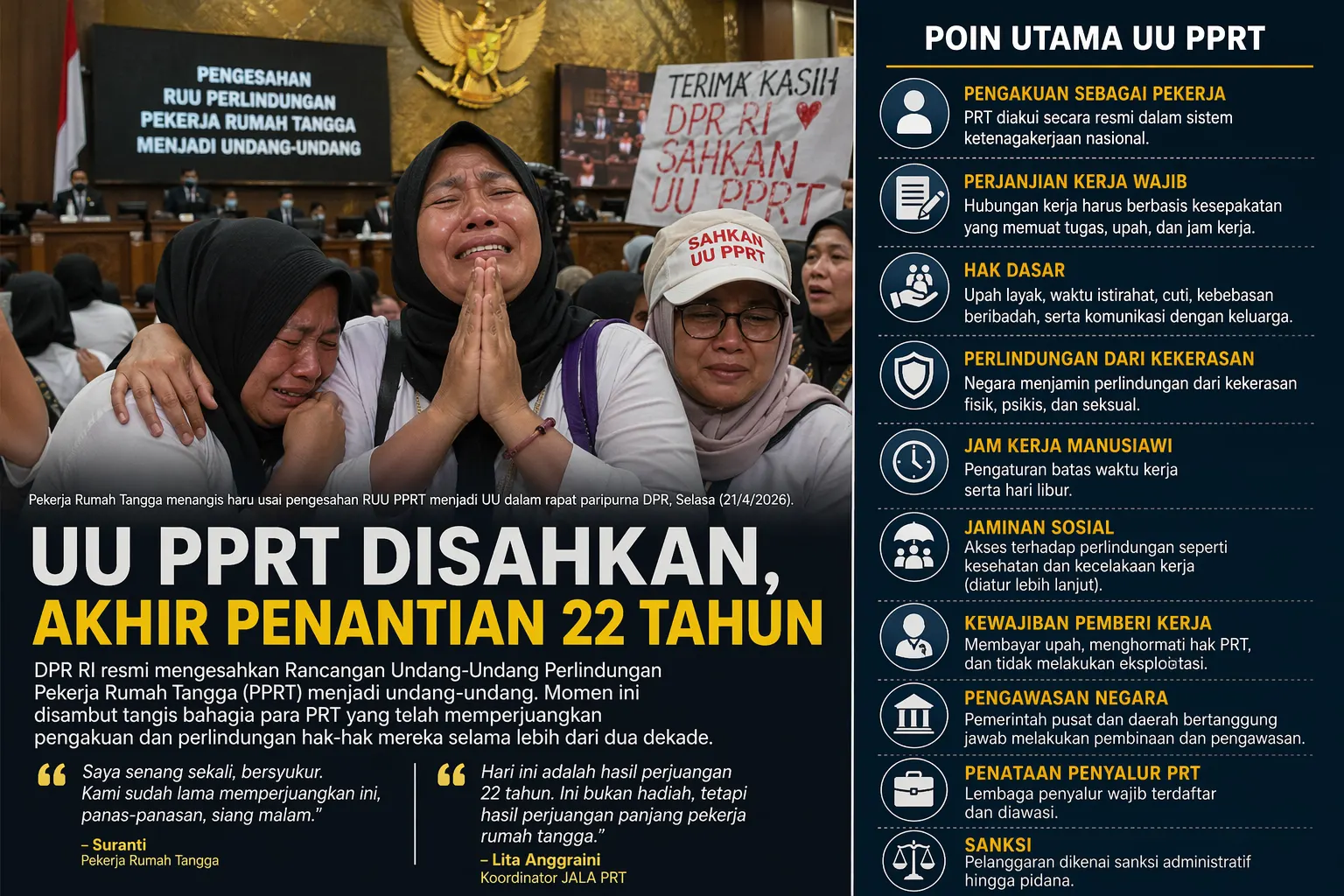 Jakarta — DPR RI resmi mengesahkan Rancangan Undang-Undang Perlindungan Pekerja Rumah Tangga (PPRT) menjadi undang-undang dalam rapat paripurna, Selasa (21/4/2026). Keputusan ini menandai berakhirnya penantian panjang bagi jutaan pekerja domestik yang selama ini belum memiliki perlindungan hukum komprehensif.