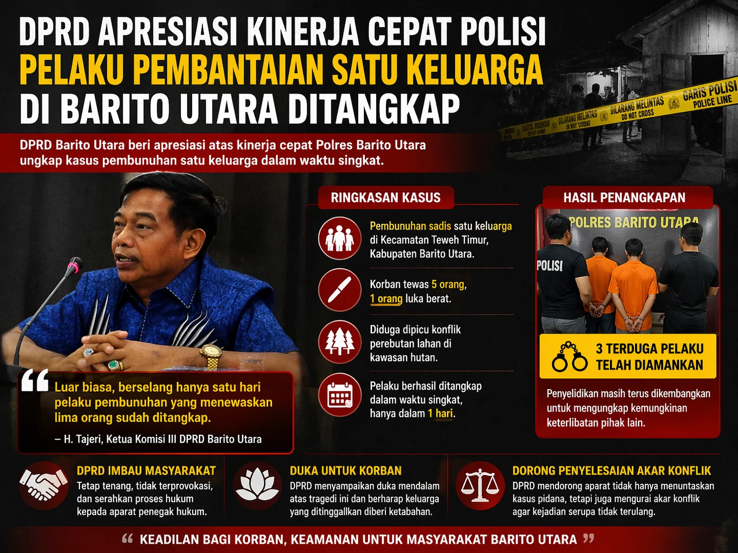 MUARA TEWEH — DPRD Barito Utara memberikan apresiasi tinggi terhadap kinerja cepat jajaran Polres Barito Utara yang berhasil mengungkap kasus pembunuhan satu keluarga dalam waktu singkat. Penangkapan pelaku dinilai sebagai respons tegas atas kejahatan brutal yang sempat mengguncang publik.