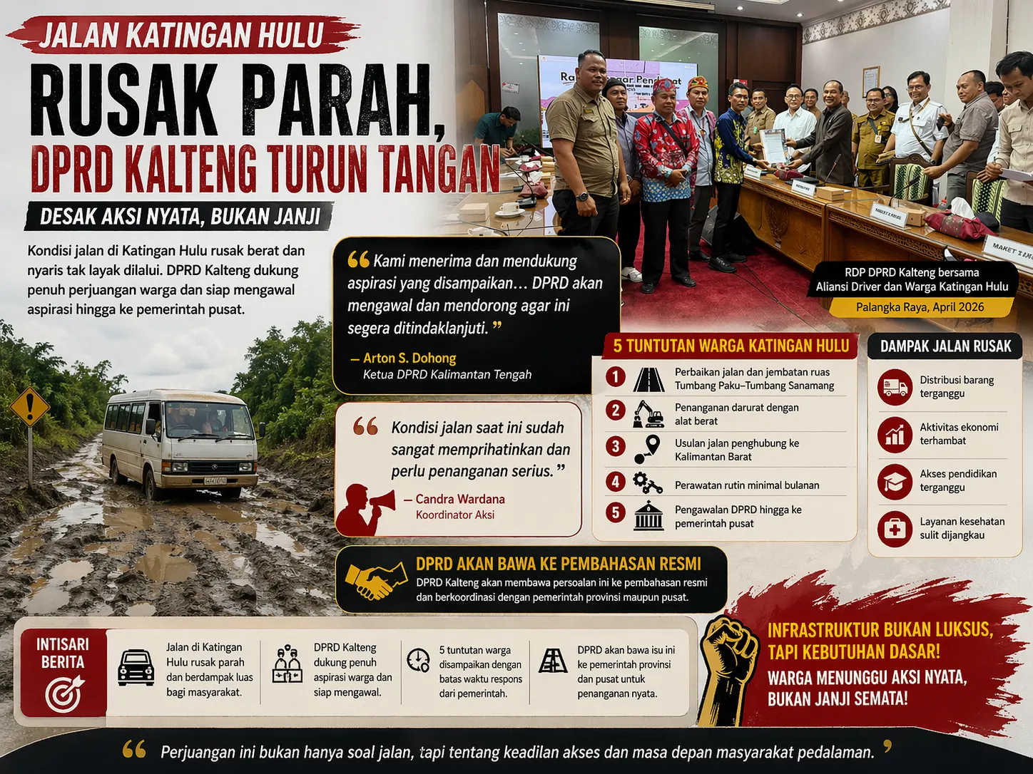 DPRD Kalimantan Tengah merespons cepat. Ketua DPRD Kalteng, Arton S. Dohong, menyatakan dukungan penuh terhadap tuntutan masyarakat yang disuarakan dalam Rapat Dengar Pendapat (RDP) bersama Aliansi Driver dan warga Katingan Hulu.