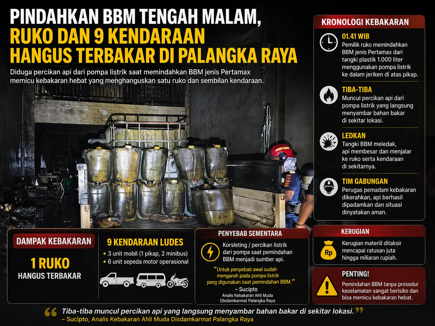 Pindahkan BBM Tengah Malam, Percikan Api Picu Kebakaran—Ruko dan 9 Kendaraan Hangus di Palangka Raya