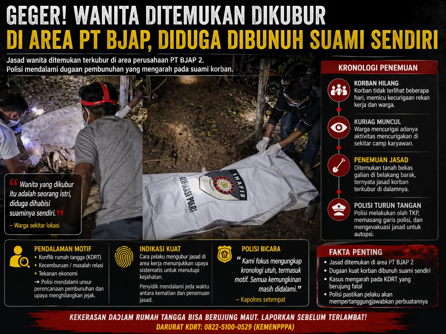 PALANGKA RAYA — Kasus penemuan jasad wanita yang dikubur di area PT BJAP 2 kian mengerucut. Polisi tidak hanya memburu pelaku, tetapi juga menelusuri detail kronologi sejak korban dilaporkan hilang hingga akhirnya ditemukan dalam kondisi terkubur.