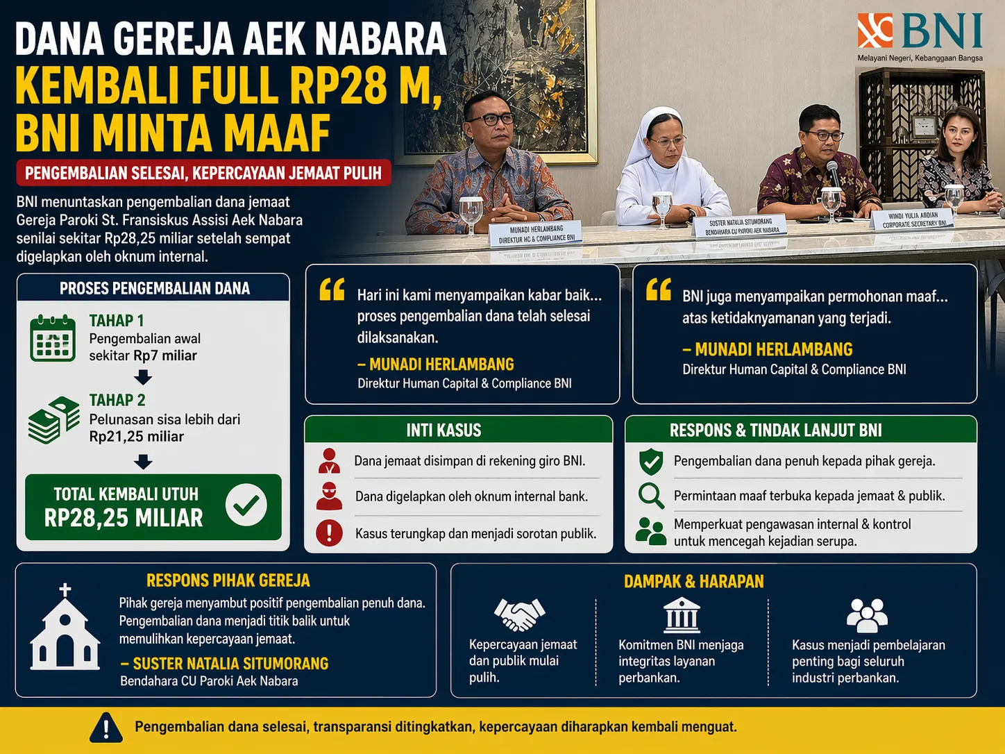 JAKARTA — PT Bank Negara Indonesia (Persero) Tbk atau BNI menuntaskan pengembalian dana jemaat Gereja Paroki St. Fransiskus Assisi Aek Nabara senilai sekitar Rp28,25 miliar. Pengembalian dilakukan penuh setelah kasus penggelapan oleh oknum internal mencuat.