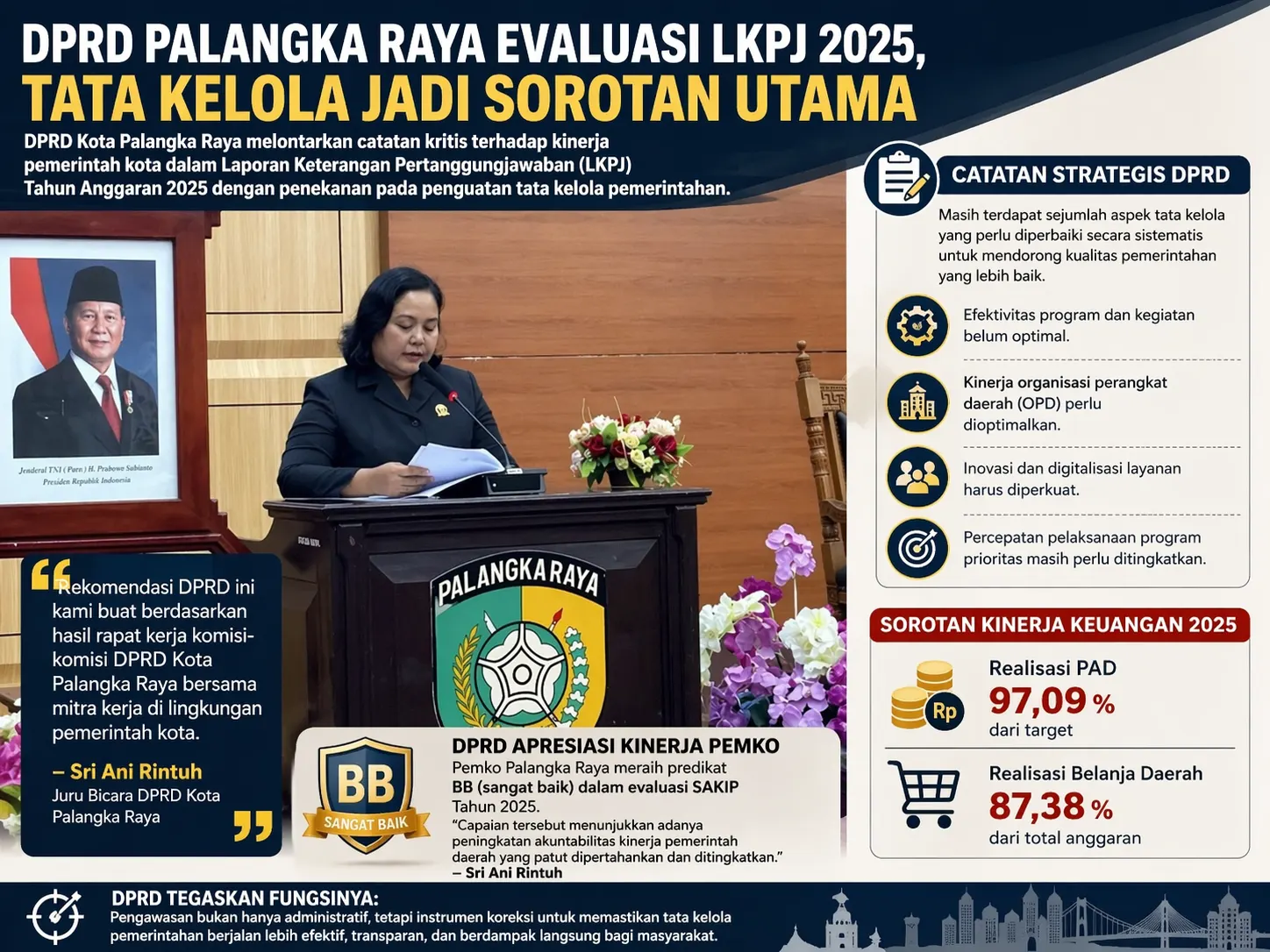 PALANGKA RAYA — DPRD Kota Palangka Raya melontarkan catatan kritis terhadap kinerja pemerintah kota dalam Laporan Keterangan Pertanggungjawaban (LKPJ) Tahun Anggaran 2025. Evaluasi tersebut disampaikan dalam rapat paripurna, Rabu (22/4/2026), dengan penekanan pada penguatan tata kelola pemerintahan.