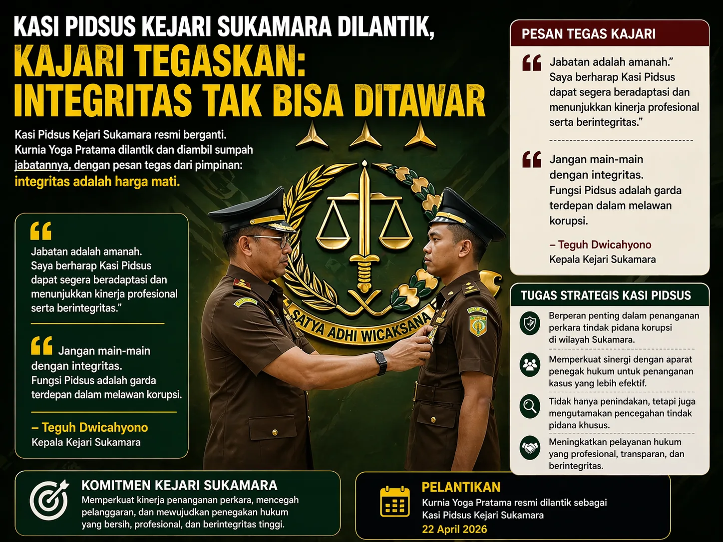 Kepala Kejari Sukamara, Teguh Dwicahyono, menekankan jabatan tersebut bukan sekadar posisi struktural, melainkan garis depan penegakan hukum, khususnya dalam pemberantasan tindak pidana korupsi di daerah.