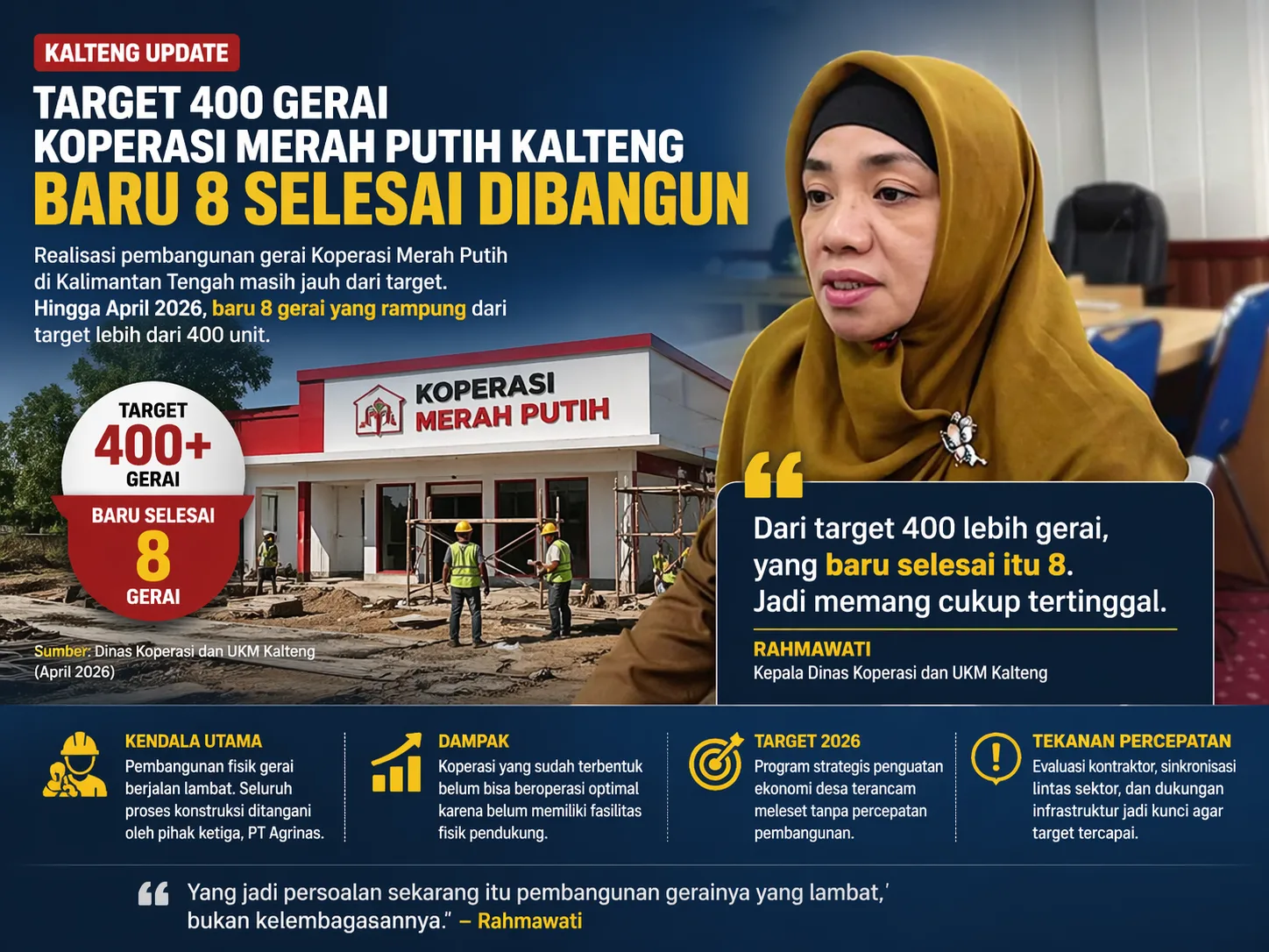 Pemerintah Provinsi Kalimantan Tengah menegaskan bahwa kendala utama bukan pada kelembagaan koperasi, melainkan pada pembangunan fisik gerai yang berjalan lambat. Seluruh proses konstruksi saat ini ditangani pihak ketiga, yakni PT Agrinas.
