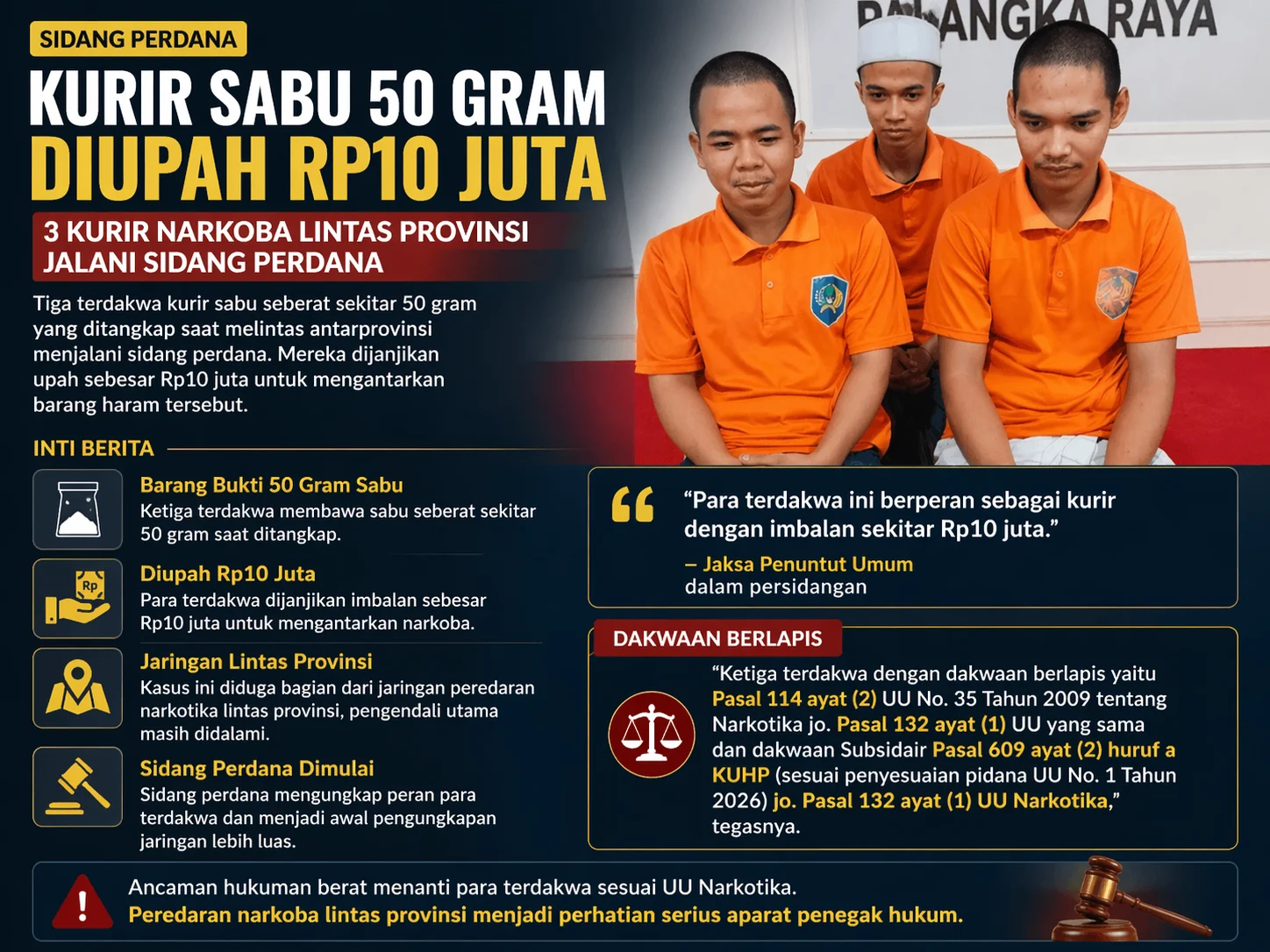 PALANGKA RAYA — Tiga kurir narkoba lintas provinsi yang tertangkap membawa sabu seberat sekitar 50 gram mulai menjalani sidang perdana di pengadilan. Para terdakwa diketahui dijanjikan imbalan sebesar Rp10 juta untuk mengantarkan barang haram tersebut.