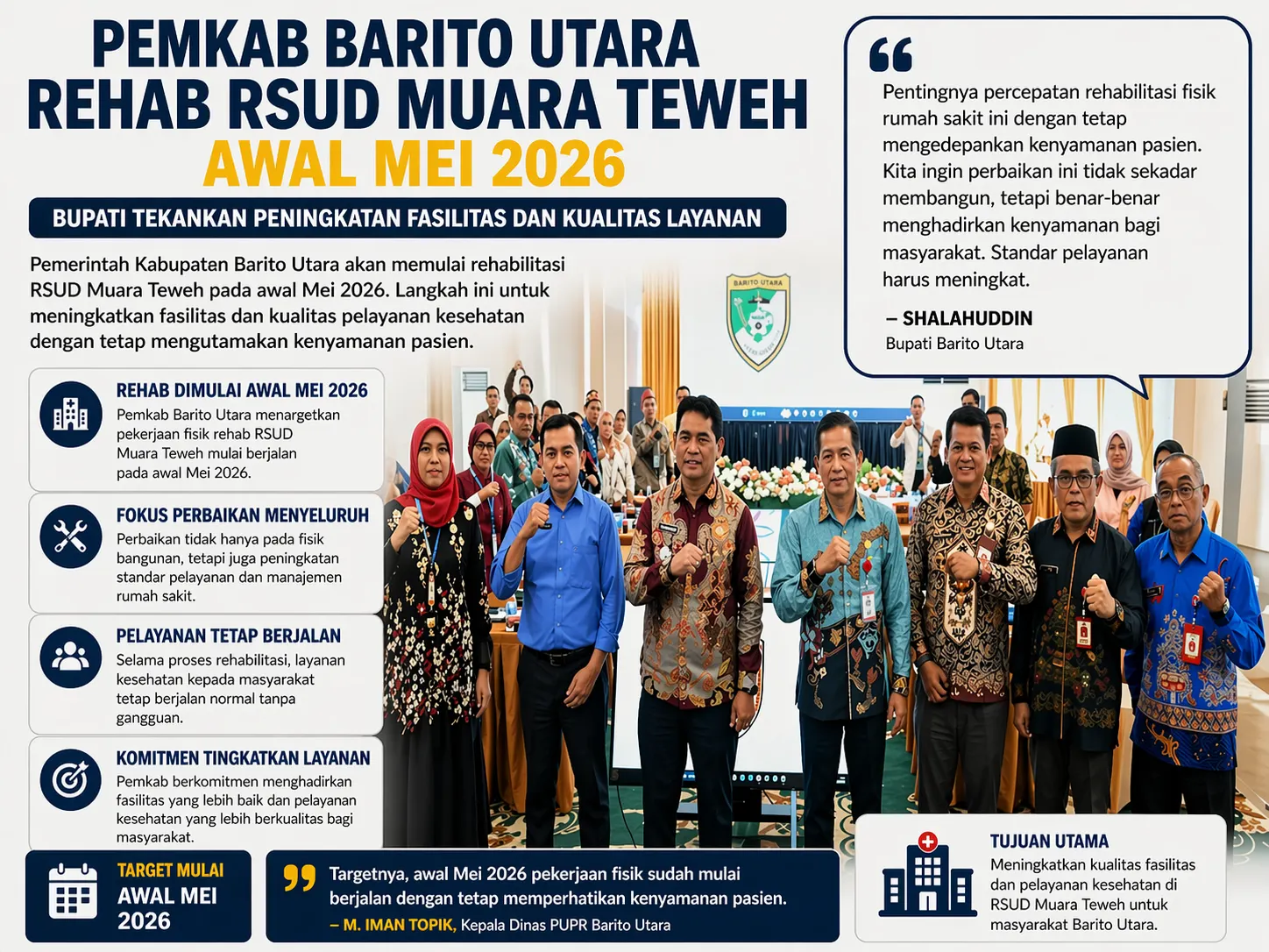 MUARA TEWEH — Pemerintah Kabupaten Barito Utara mempercepat peningkatan layanan kesehatan dengan memulai rehabilitasi Rumah Sakit Umum Daerah (RSUD) Muara Teweh pada awal Mei 2026. Langkah ini menjadi bagian dari pembenahan menyeluruh, tidak hanya pada infrastruktur, tetapi juga kualitas pelayanan.