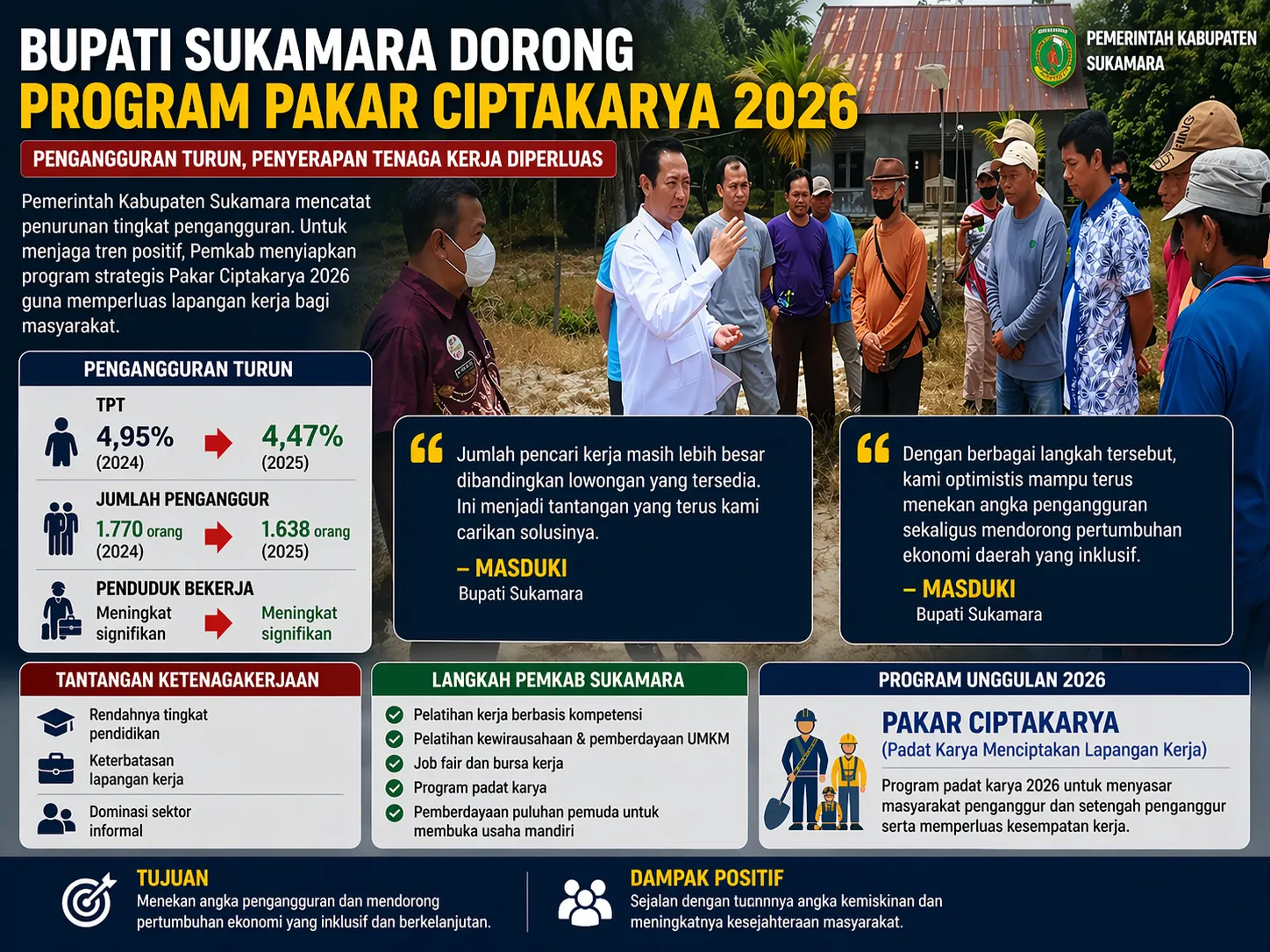 SUKAMARA — Pemerintah Kabupaten Sukamara mencatat penurunan tingkat pengangguran, namun menegaskan tantangan ketenagakerjaan belum sepenuhnya teratasi. Untuk menjaga tren positif, pemerintah menyiapkan program strategis Pakar Ciptakarya 2026 guna memperluas penyerapan tenaga kerja.