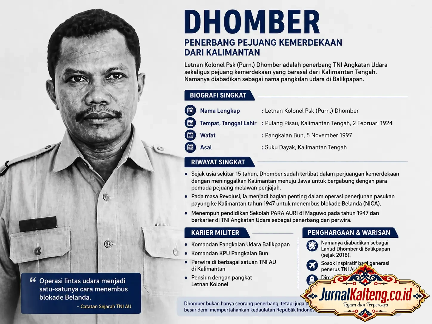 PALANGKA RAYA – Nama Letnan Kolonel Psk (Purn.) Dhomber kembali mencuat sebagai salah satu tokoh kunci dalam sejarah perjuangan udara Indonesia, khususnya dalam upaya merebut Kalimantan dari tangan Belanda pada masa revolusi.