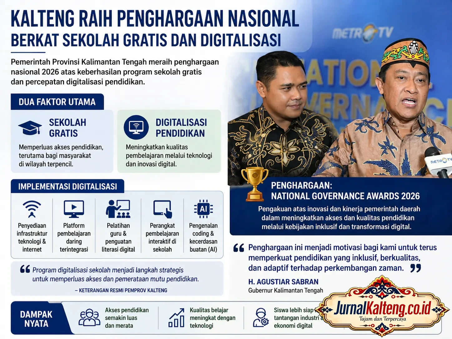 Pengakuan tersebut diberikan dalam ajang National Governance Awards 2026, yang menilai inovasi dan kinerja pemerintah daerah. Program pendidikan Kalteng dinilai menonjol karena menyasar dua persoalan krusial sekaligus: akses dan kualitas.
