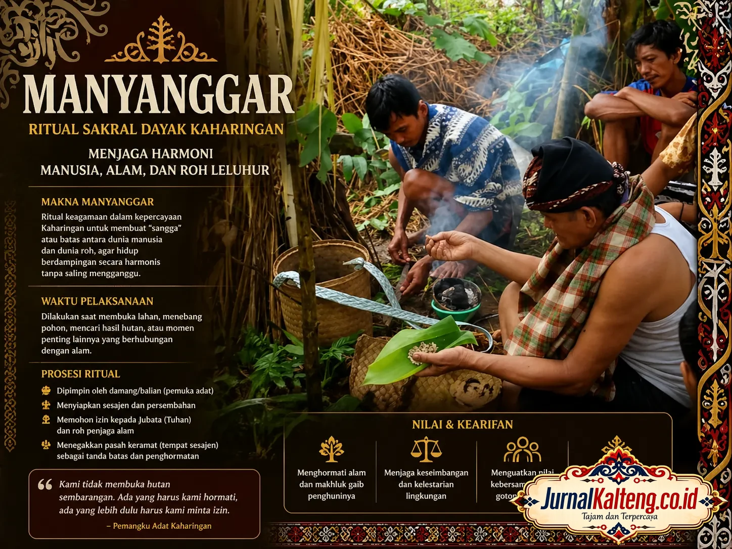“Manyanggar dimaknai sebagai upaya menjaga keseimbangan antara manusia dan alam, sekaligus bentuk penghormatan terhadap kekuatan yang tidak terlihat,” sebagaimana dijelaskan dalam kajian budaya Dayak.