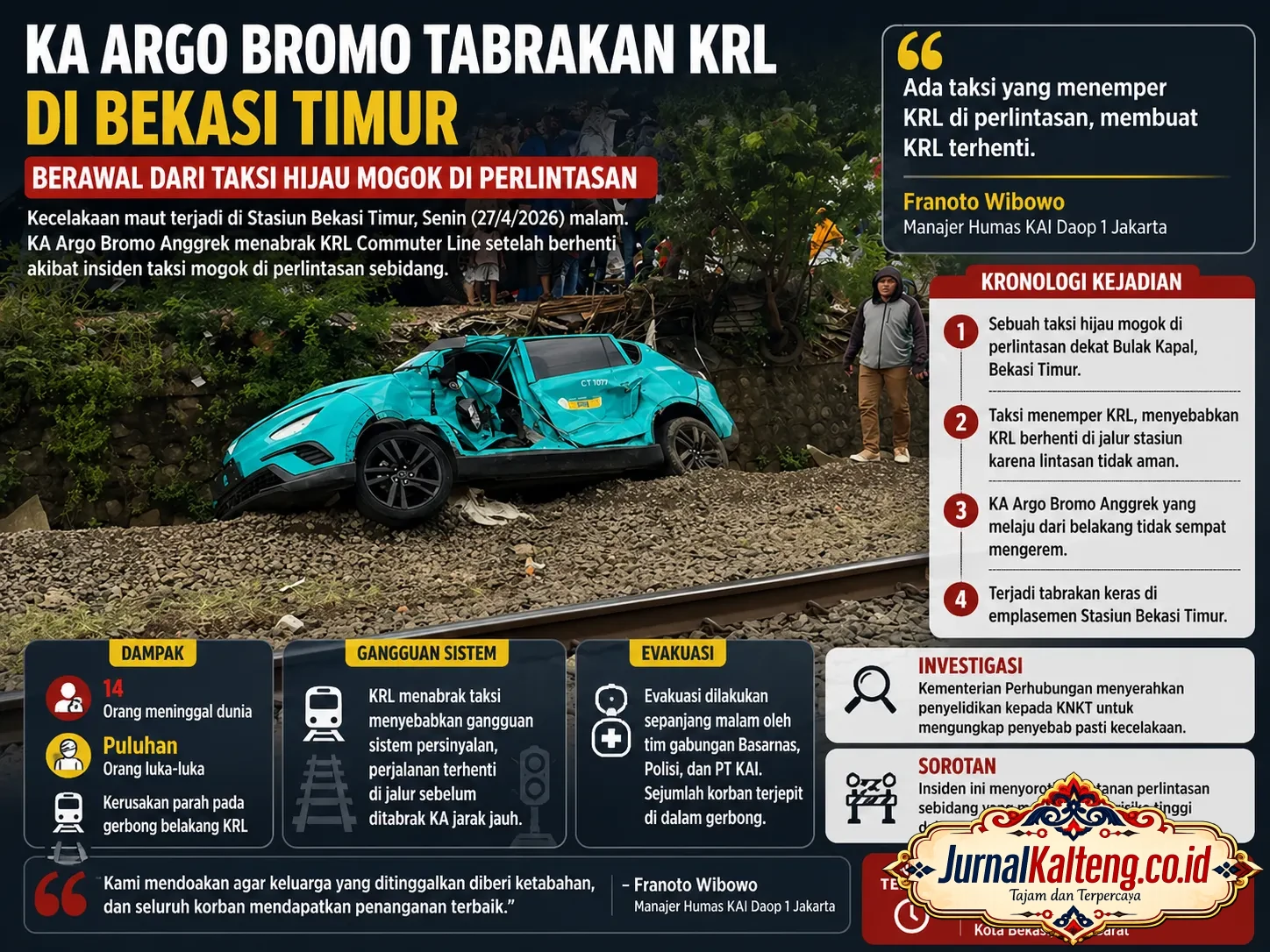 BEKASI — Kecelakaan maut antara Kereta Api (KA) Argo Bromo Anggrek dan KRL Commuter Line di Stasiun Bekasi Timur, Senin (27/4/2026) malam, bermula dari insiden di perlintasan sebidang yang melibatkan sebuah taksi berwarna hijau.
